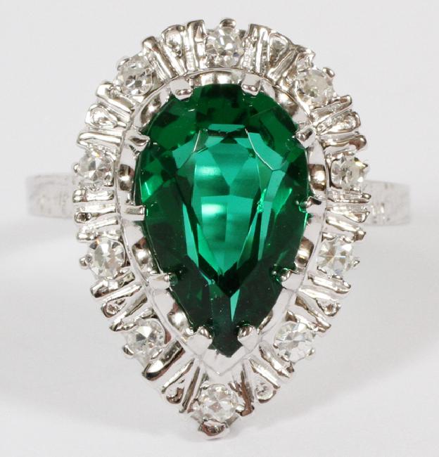 7CT LAB EMERALD AND DIAMOND RING, SIZE 6. 5:A 7ct lab pear cut emerald surrounded by .5ct natural round diamonds in 14kt white gold. The diamonds have a G color and Vs-2 clarity. Weighs 5.7 grams.