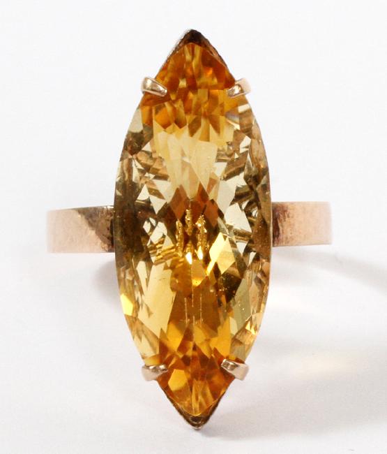 12CT NATURAL CITRINE VINTAGE RING, SIZE 7:A vintage style 12ct natural citrine cut into a marquise form on a 14kt gold shank. Weighs 3.2 grams.