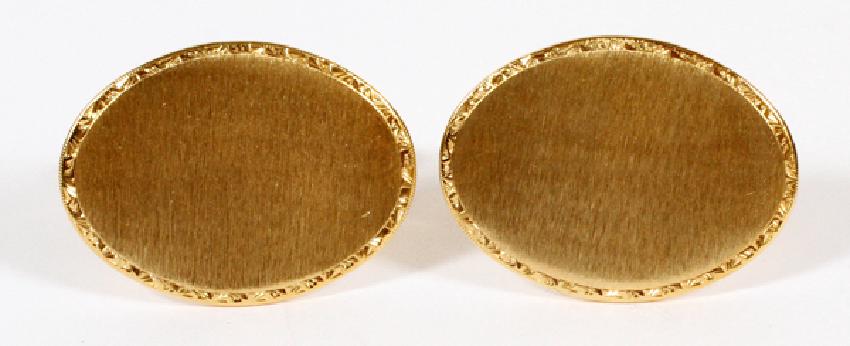 14KT YELLOW GOLD GENTLEMAN'S CUFFLINKS, PAIR, W 1":A pair of 14kt brushed yellow gold oval form cufflinks. Weighs 12.9 grams.