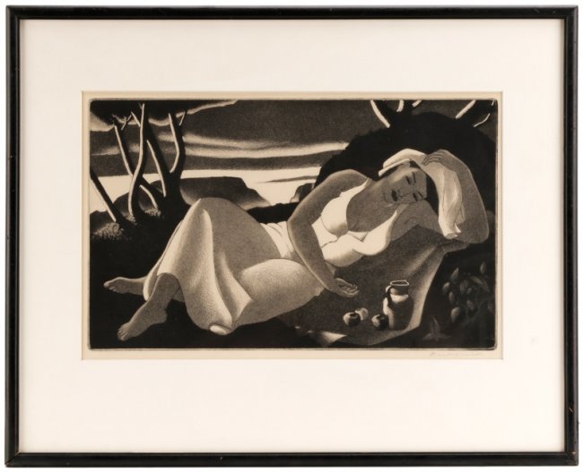 Doel Reed (American, 1895-1985), "Rest"-1941, etching and aquatint on wove paper, pencil signed lower right margin, published by Associated American Artists (AAA), New York in an edition of 100, verso with information from AAA on work. Framed approximately 16.75" x 20.75". Unframed approximately 9.75" x 15.25". Provenance: From the Private Collection of Benno & Babette Rothschild, Columbus, Georgia. Reference: Cohen & Rogers, 43.