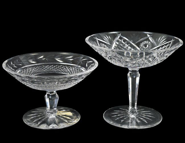 WATERFORD CRYSTAL COMPOTES, 2 PCS.:One is H 4 5/8", Dia 6 1/4" with diamond designs and pedestal base; while the second is H 5 1/4, Read more…