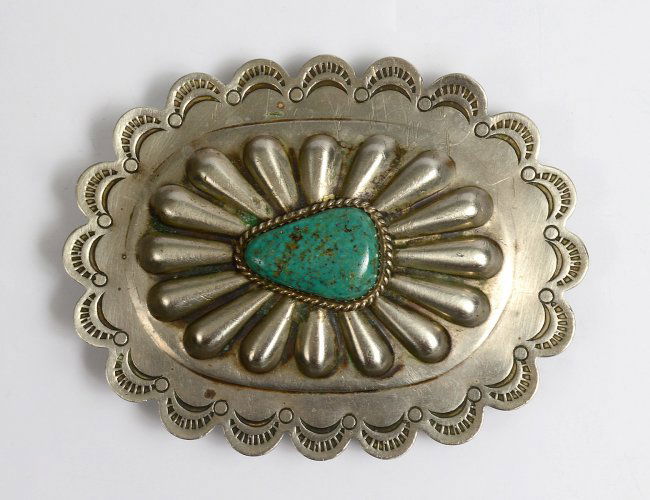 A 20th century Native American sterling silver belt buckle of oval form with concentric decoration with dentilated border, radiating feathers and almond form at center. Read more…