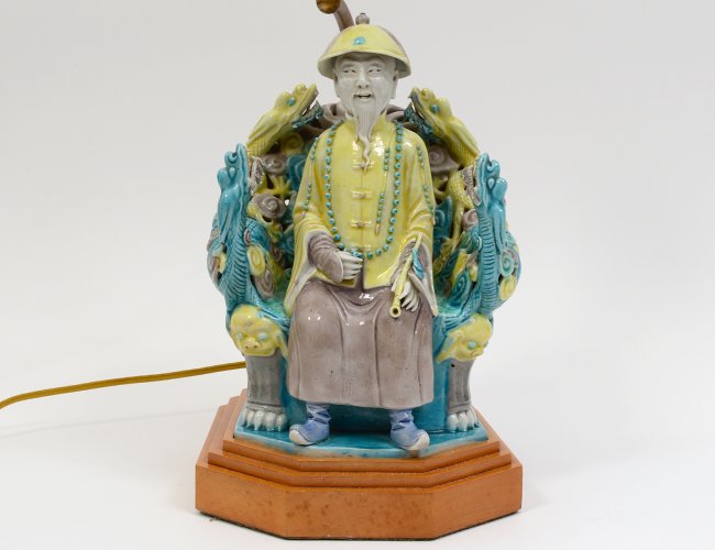 Chinese. Qing Dynasty. 19th Century. Of a Mandarin official seated on an elaborate dragon chair. Height 9 1/2". (Now mounted as a lamp) (Cond: chip to cap) (300/400) Provenance: Mrs. Judith Taubman, 1820 So. Ocean Blvd., Palm Beach, FL