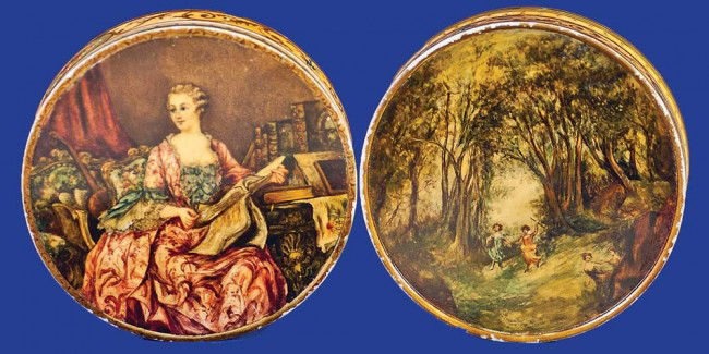 French. 18th/19th Century. Of circular shape, the cover depicting a lady reading a book in a parlor, the underside with figures in a forest. Diameter 3 3/4". (500/700) (NOTE: INTERNATIONAL SHIPPING IS NOT AVAILABLE FOR THIS ITEM; ITEM WAS LEGALLY IMPORTED INTO THE U.S.; SPECIES IS ELEPHANT IVORY)
