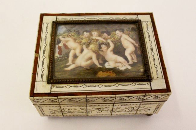19th century. Dresser box with hinged lid and top decorated with hand painted scene of seven nude putti figures in a group holding garlands of flowers and fruit in an outdoor setting. Indistinctly signed lower right. Painted image on box mounted ivory with flower and foliate decoration. Interior of box with tortoise shell mounts on edges. Box raised on four metal ball feet. Height 2.5 inches, width 4.75 inches, depth 3.75 inches.