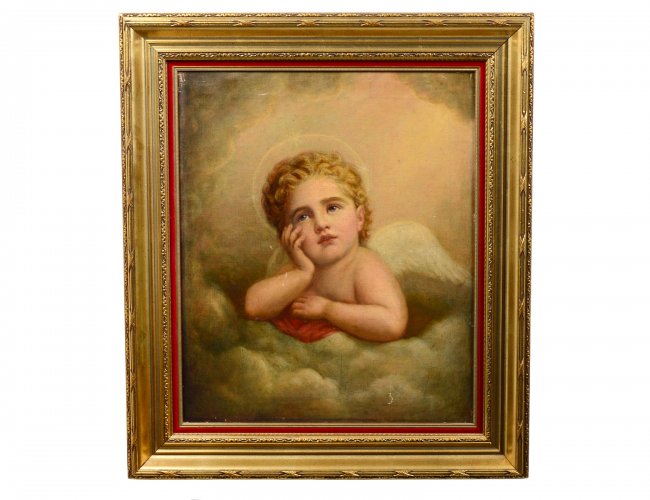 "Winged Putto". Unsigned. Oil on Canvas. Measuring 23 1/2" by 19 1/2". Gilded frame. (Cond: original canvas, minor abrasions, will need restoration) (700/900)