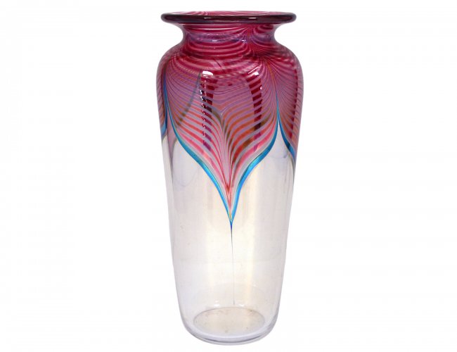 JOHN LOTTON STUDIO GLASS VASE, 1990, H 6 3/4":An opalescent purple glass with layered pink, green and cream colored glass forming vines and flowers. Signed Read more…