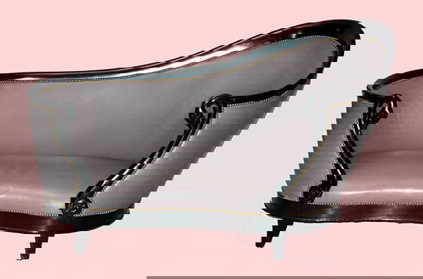 Ebonized and Purple Leather Swan Neck Settee. Brass Studded. Good Condition with Some Losses to Ebonization. Measures 36 Inches Tall 60 Inches Wide by 23 Inches Deep. We Will Not Ship Nor Pack This Item Due To Its Size. Please Contact a Third Party Shipping Company To Make Arrangements To Have This Item Shipped To You. We Will Be Happy To Provide You With a List Of Our Approved Shipping Companies at Your Request.