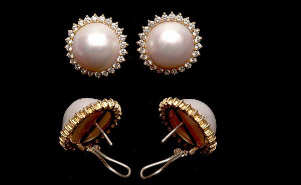 Pair Mabe Pearl Diamonds and 18kt Gold Earrings. 24 Diamond Points. Measures 7/8 inches diameter. Good Condition with light scratches from wear. Shipping $12.00 (1500/2000)