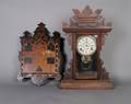 Jacobean Style Oak Cabinet on Stand, upper section with tombstone paneled doors, shelved interior; lower section with two long drawers, on turned legs joined by curved stretchers, ht. 77 1/4, wd. 38, dp. 13 in.